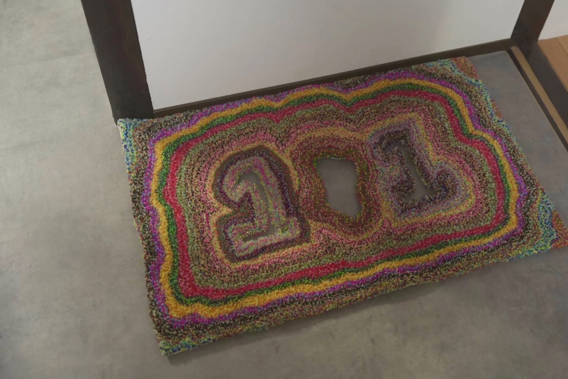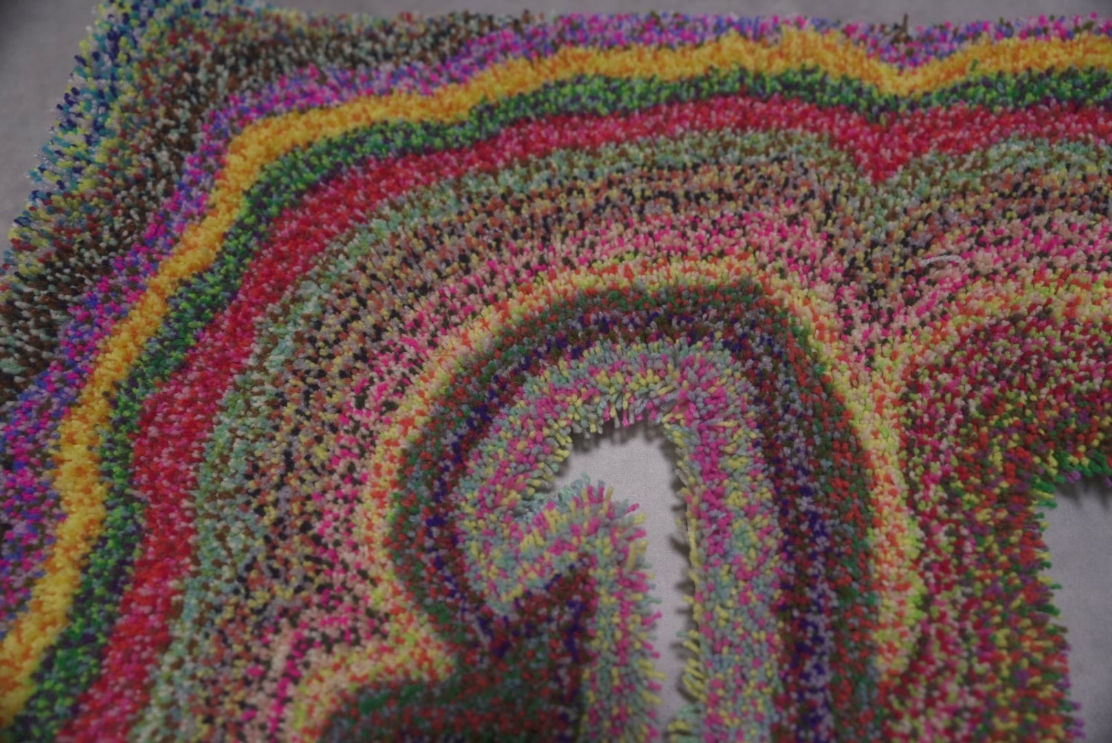 異なる5色の毛糸を何度も配合を変えながら内側から外に向かって広げたカジュアルなデザインラグ。