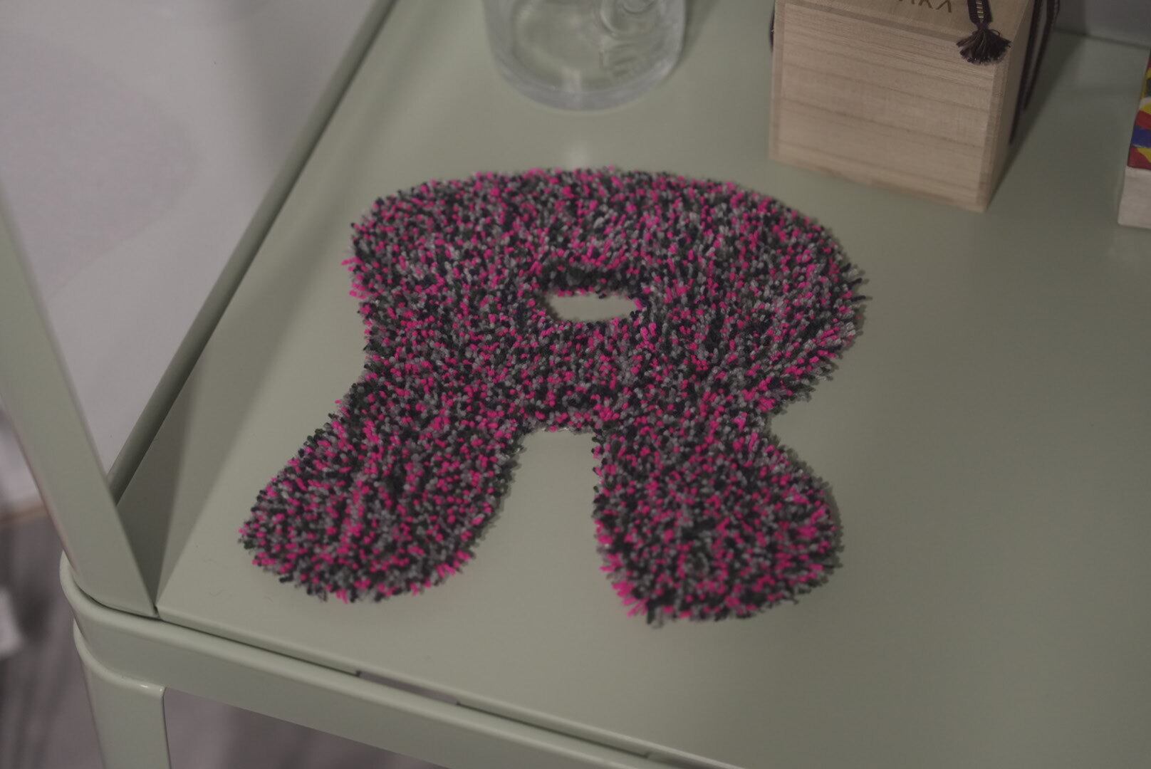 アルファベットをそのままラグにした小物置きです。異なる5色のアクリル毛糸を使用しもっちりふわふわな手触り。