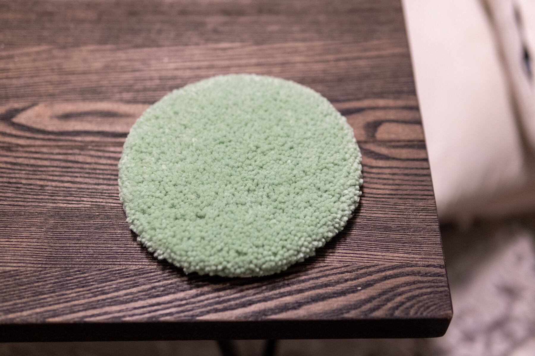 ただのまるだからこそフォルムにこだわって作りました。ずっしりとした毛糸の手触りと縁のカーブが効いた暖かみのあるラグです。